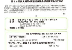 2020年2月14日 総合お知らせ 南大阪薬-薬連携協議会学術講演会で発表しました 令和2年2月12日に開催された学術講演会の一般講演で、「ポリファーマシー対策! よくわかる 局内手順書作り」のテーマで発表致しました。